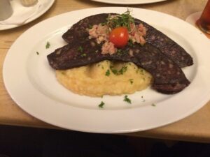 - Die gedünsteten Äpfel und Zwiebeln auf dem Kartoffelpüree anrichten und die gebratene Blutwurst darauf verteilen.